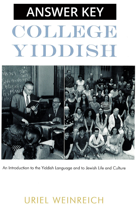 The answer key to the world-famous textbook,  College Yiddish, by Uriel Weinreich. The answers were prepared by the late Naomi Prawer-Kadar and Bina Weinreich; at an earlier stage, Sonia Pinkusowicz-Dratwa and Chava Lapin also participated in the work. The manuscript was typed by Shaindel Fogelman, edited by Gosia Zaremba and reviewed by Paul Glasser.