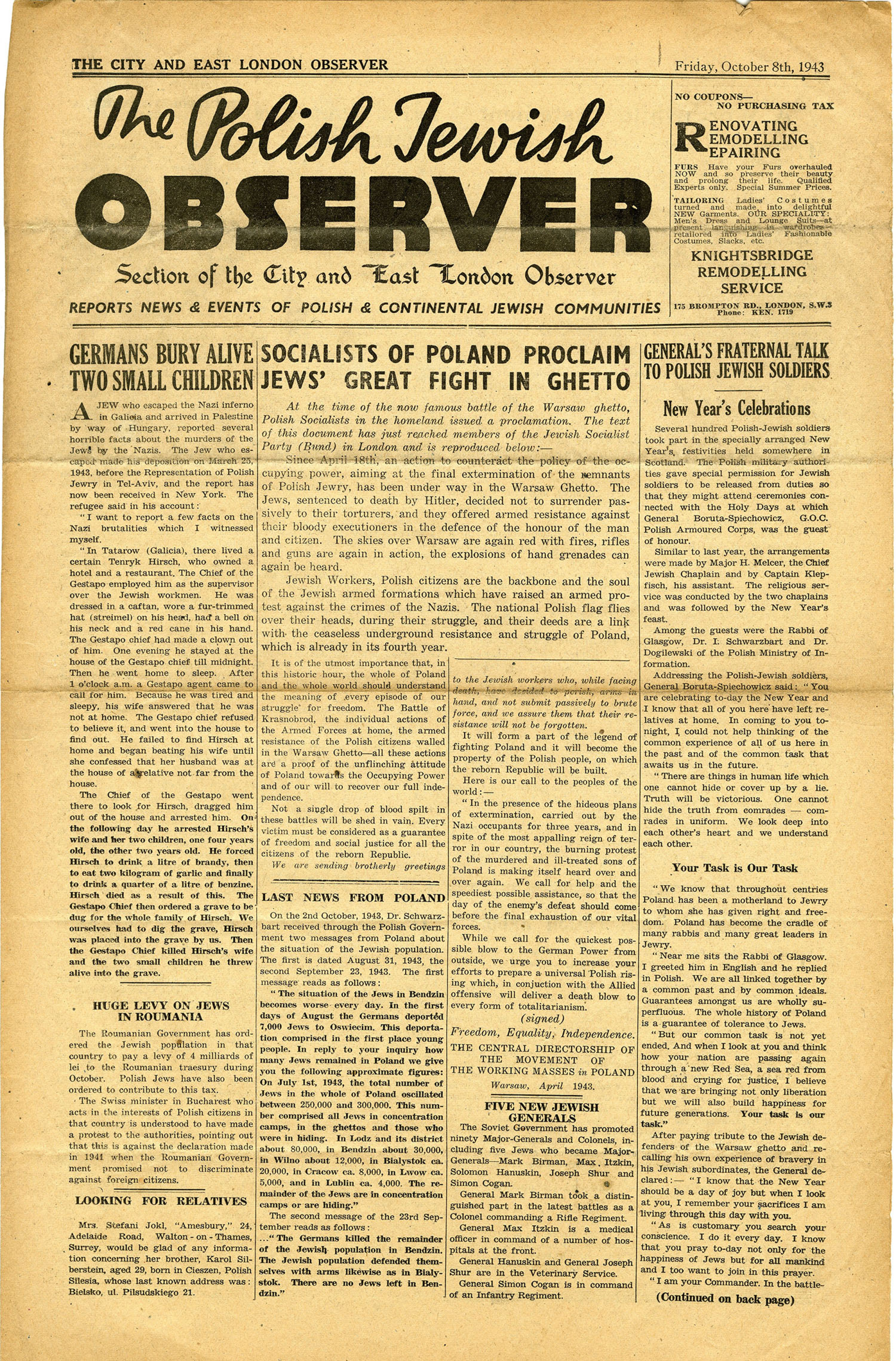 Front Page of The Polish Jewish Observer's October 8, 1943 publication. From the YIVO Library.